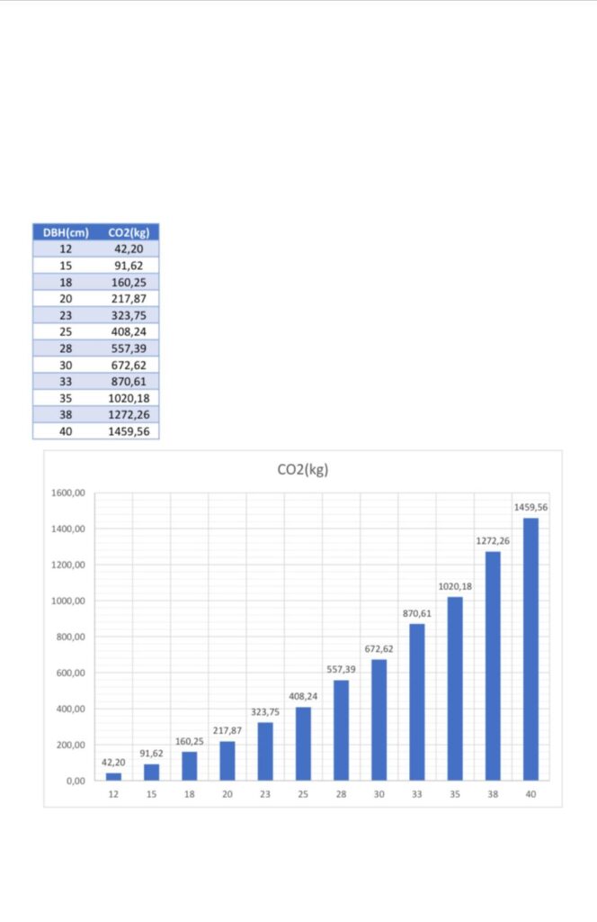 Growth that translates into measurable CO₂: on the reference curve, stored CO₂ per tree increases sharply with DBH: 12 cm → ~42 kg, 20 cm → ~218 kg, 30 cm → ~673 kg, and 40 cm → ~1,460 kg CO₂ (cumulative per tree).